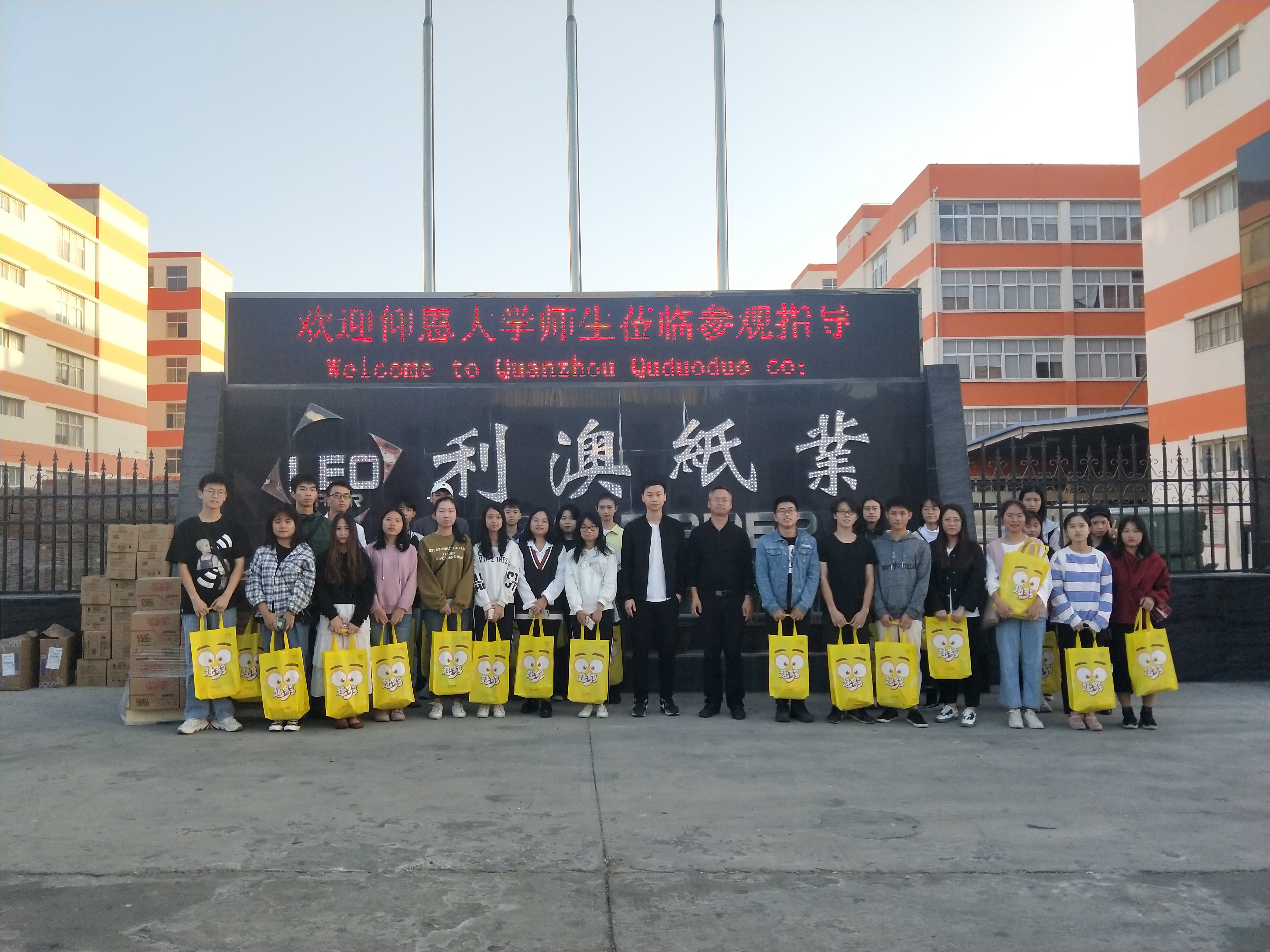 师生与趣多多卫生用品有限公司董事长合影 趣多多卫生用品有限公司张静胜厂长带领师生到生产车间,同学们带上口罩和头罩,参观了纸尿裤无菌自动化生产线,对公司加强科技研发提升品牌自主创新能力有了更为深刻的认识。